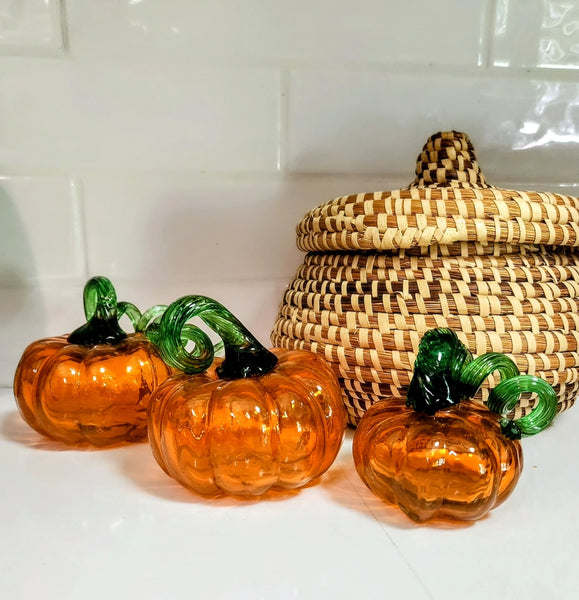 Artisan hand blown glass pumpkins. Made individually, each pumpkin is a unique creation from the glass blowing process.