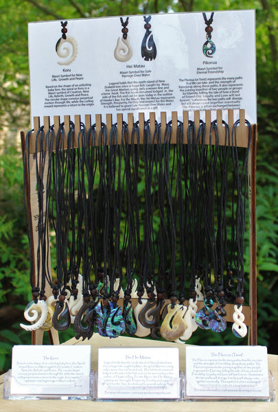 40 piece wholesale assortment of Hei Matau symbol for Safe Passage Over Water, Koru Symbol for New Life, Growth and Peace and Pikorua Symbol for Eternal Friendship with a cherrywood display.